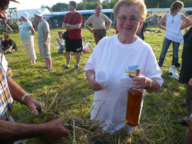 Deux gaillards fabriquaient tout d'abord avec la paille une tresse des plus solide puis s'en aller chercher à la maison la "Patronne" Ils l'asseyaient sur cette tresse la suspendait puis l'amenait au champ. La "Patronne" avait préalablement mis dans son tablier une vieille bouteille de "lambig" de sa récolte personnelle (ben oui en Bretagne l'alcool de pommes s'appelle du lambig) et quand elle arrivait sur les lieux du battage elle offrait un petit verre de cet excellent breuvage à boire avec modération.