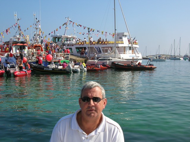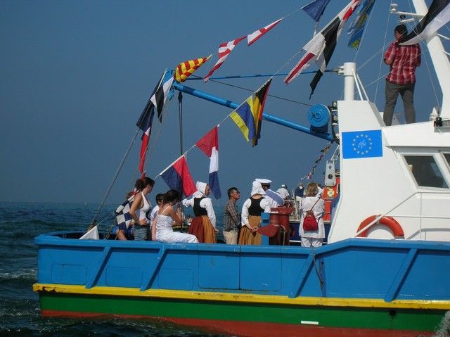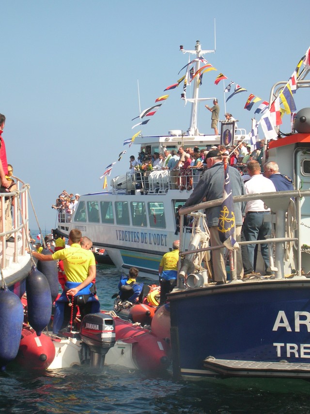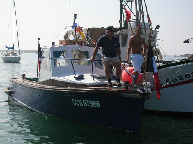 La vedette "Aigrette II" sur laquelle se trouve la gerbe de fleur, et notre Joël.