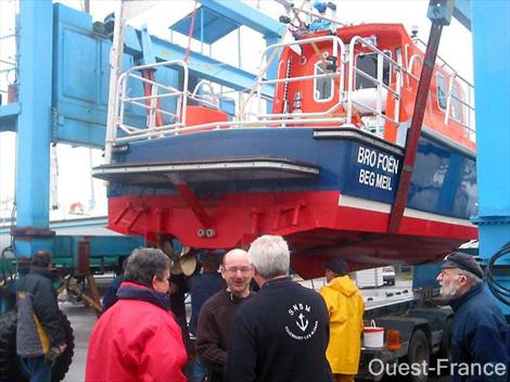 Bro Foën (Pays fouesnantais), la nouvelle vedette de la SNSM est livrée lundi 26 février à Port La Fôret en remplacement de la Régine Dumée qui avait été mise en service en 1994. Navire de 9 m de long pour 3,60 m de large est équipé de deux moteurs de 125 CV. La coque a été construite au chantier Blamengin à Boulogne (Pas-de-Calais) puis aménagée par les ateliers nationaux de la SNSM basés à Saint-Malo pour ce qui concerne l'accastillage, l'électronique, le moteur, etc. Le coût total avoisine les 200 000 €, il a été pris en charge à parts égales par le siège de la SNSM, la Région Bretagne, le conseil général du Finistère et la station locale. 4 ou 5 personnes à bord en intervention, pour un équipage total de 14 bénévoles, souvent d'anciens marins pêcheurs. Le président de la station est René Bernard. | ![]() |