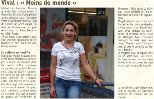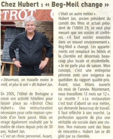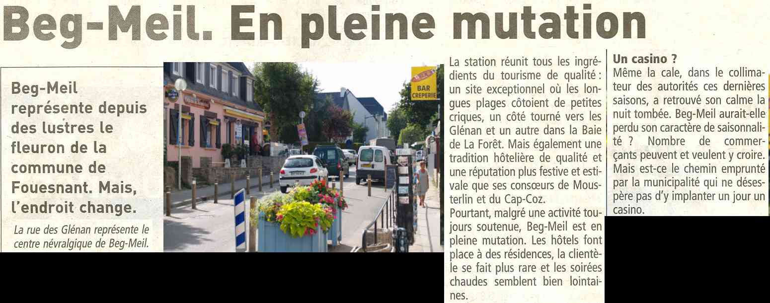 Le titre du spécial Télégramme veut tout dire : "Beg-Meil" en pleine mutation", mais aussi "Chez Hubert : Beg-Meil change" , "Kerolland : une place pour le camping-cars" , "Vival : moins de monde" , "Brasé Rad: haro sur la concurrence des associations" Si certains commerçants gardent une certaine retenue, ce n'est pas le cas de Gilles Foulon et Philippe Debout. Les gérants du Brasé Rad, bar-restaurant, ouvert à l'année tirent à boulet rouges sur les associations et, par ricochet, sur la municipalité et le comité des fêtes. «Beg-Meil est en train de mourir» Gilles Foulon en appelle à la mobilisation générale. «Il n'y a plus d'animations, les concerts sont interrompus par la gendarmerie, et surtout, sous couvert du monde associatif, nous subissons une concurrence totalement déloyale. Notamment au niveau des tarifs. Se rendent-ils compte? Si les commerçants partent, Beg-Meil est rayé de la carte. Les gens commencent d'ailleurs à bouder la station. D'ailleurs c'est clair, on va bientôt ouvrir une maison de repos». Des propos durs et acerbes corroborés par des commerçants voisins. «Une association proposait récemment un moules-frites à 5 € 50. Il faut se mettre autour d'une table et en parler». Gilles Foulon prend moins de pincettes. «La municipalité autorise ces soirées, malgré nos injonctions. Nous réfléchissons à des actions en commun». Ambiance quelque peu houleuse en plein centre d'une station dite balnéaire. Les interruptions de concert en début de soirée, sur plainte d'un riverain, n'ont fait qu'amplifier le malaise. «On nous empêche de travailler». Et là encore, le constat est identique: la saison ne fait plus le bonheur. «Sur l'année, notre chiffre d'affaire est en hausse. Par contre, sur la saison, on peut déjà annoncer une baisse de 15%».