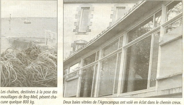 13 mars. La brigade de gendarmerie de Fouesnant a été prévenue de dégradations commises à la cale de Beg-Meil, très certainement dans la nuit de vendredi à samedi. Des exactions découvertes au petit jour par un bénévole de la SNSM locale. En présence du capitaine du port, Georges Le Quilliec, les gendarmes ont constaté une vitre brisée et une porte fracturée au rez-de-chaussée du bâtiment qui abrite notamment à l'étage, les locaux de la capitainerie et de la SNSM. Aucun vol n'a toutefois été commis. Par ailleurs, toutes les portes des toilettes ont été enfoncées et nombre de bouteilles vides ont été brisées et pour partie épandues sur la cale. Un extincteur a également été vidé. De plus, une chaîne d'environ 800kg a été poussée à l'eau par un, ou plus certainement plusieurs individus. Les casseurs s'en sont également pris à un portail, rue des Glénan, et aux baies de l'Agrocampus (ex-Cempama), dans le chemin creux.