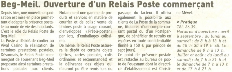 Lundi 31 mai 2010 dans Ouest-France. La cale de Beg-Meil est désormais protégée du stationnement intempestif des véhicules qui se garent souvent devant la capitainerie malgré les panneaux d'interdiction, surtout l'été. Depuis une semaine, une barrière levante avec lecteur de badge en réglemente l'accès. Sont seuls autorisés les véhicules de service et de secours, et ceux de la vente à l'étal de poissons. Les plaisanciers qui ont besoin d'accéder au port avec leur véhicule peuvent demander l'ouverture de la barrière, par interphone, aux agents de la capitainerie présents. Les Beg-Mellois et les touristes amateurs de calme apprécieront de retrouver une certaine sérénité !
