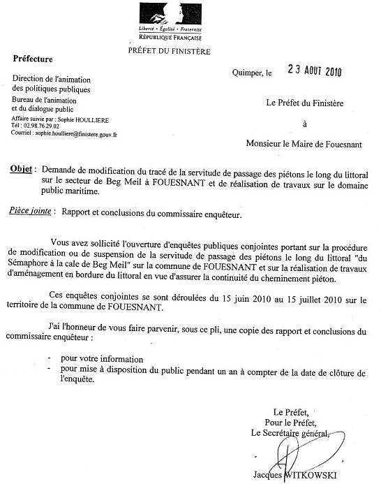 Le commissaire-enquêteur note « que la nécessaire procédure de modification ou de suspension de la servitude de passage des piétons de long du littoral, du sémaphore à la cale de Beg-Meil, est d’intérêt général. Le public est dans l’attente du dossier mais il conteste le tracé proposé. Le projet, bien que perfectible, propose un tracé tendant à concilier les intérêts en présence, dans le respect de la loi (et des décisions du Conseil d’Etat). Par la voie de consensus, des solutions étudiées sont proposées : des aménagements adaptés à la configuration des lieux et présentant un minimum d’impact sur l’environnement, la préservation de la sécurité des promeneurs et aussi des riverains ainsi que le respect de l’intimité de ceux-ci sont pris en compte.