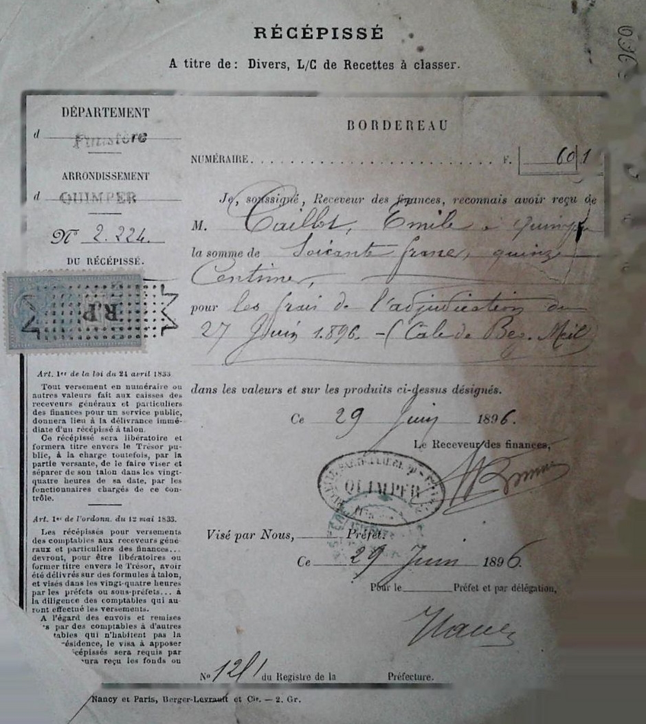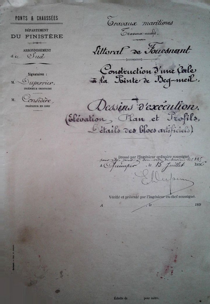 Le 27 juin, l'adjudication des travaux de la cale de Beg-Meil a lieu à 2 heures de l'après_midi, dans la salle ordinaire des adujudications de la préfecture à Quimper. Emile Caillot, domicilié à Fouesnant, emporte la marché pour une valeur de 5 056,86 francs. La réception provisoire des travaux de la cale à la pointe de Beg-Meil se déroule le 31 décembre 1896, par Caillot fils, entrepreneur à Quimper, excécutés pour un montant de 3 093,20 francs.