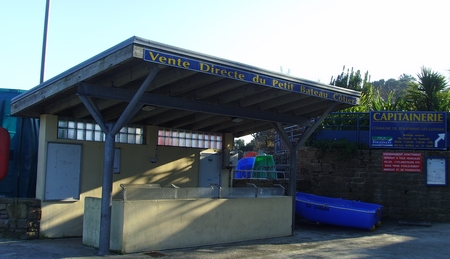 Aménagement d'une étale à poisson de la vente directe de crustacés et de poissons par les pêcheurs des environs.