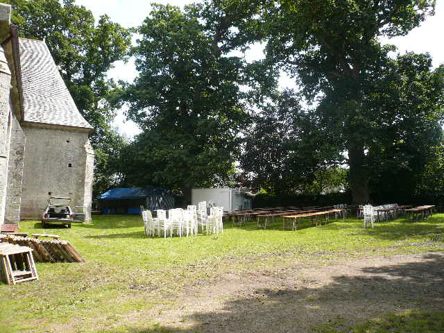 A la sortie de la messe pas grand monde sur les chaises devant le podium ou sous le barnum restauration