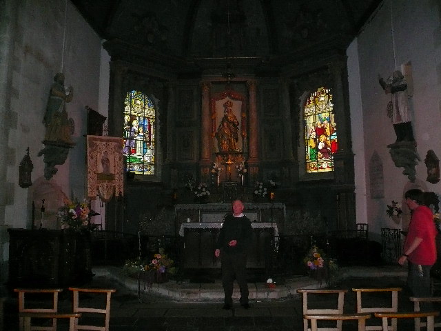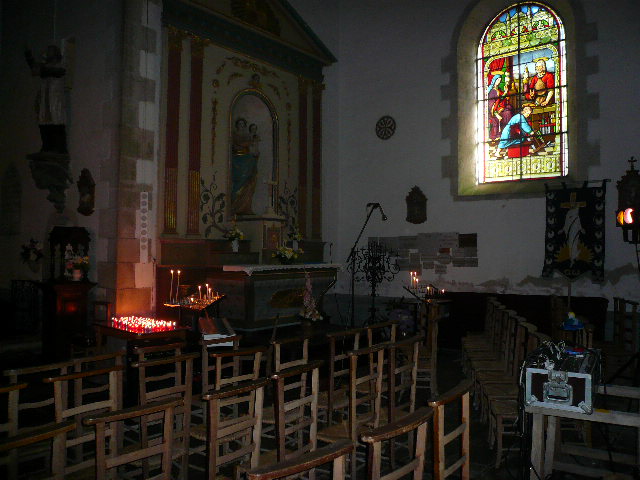 Et le dimanche arriva. Comme prévu il pleut et il n'y aura pas de procession et la messe sera dite à l'intérieur dont voici 2 photos. Photos non retouchées pour mieux faire ressortir les vitraux.