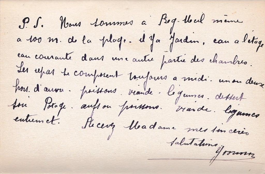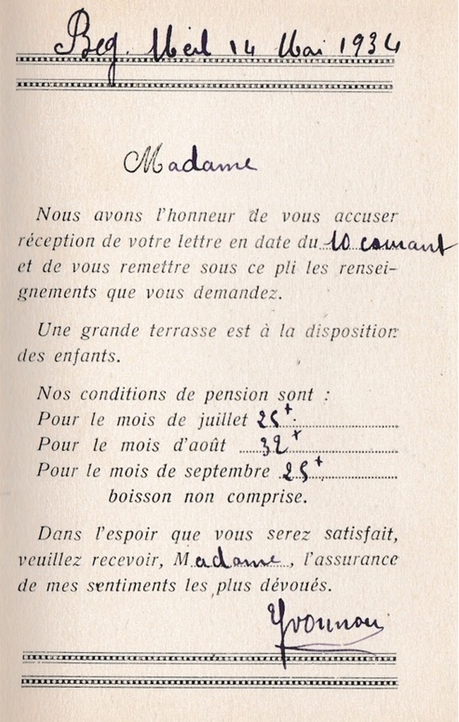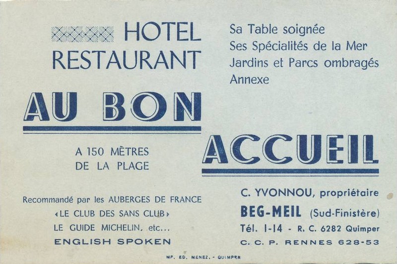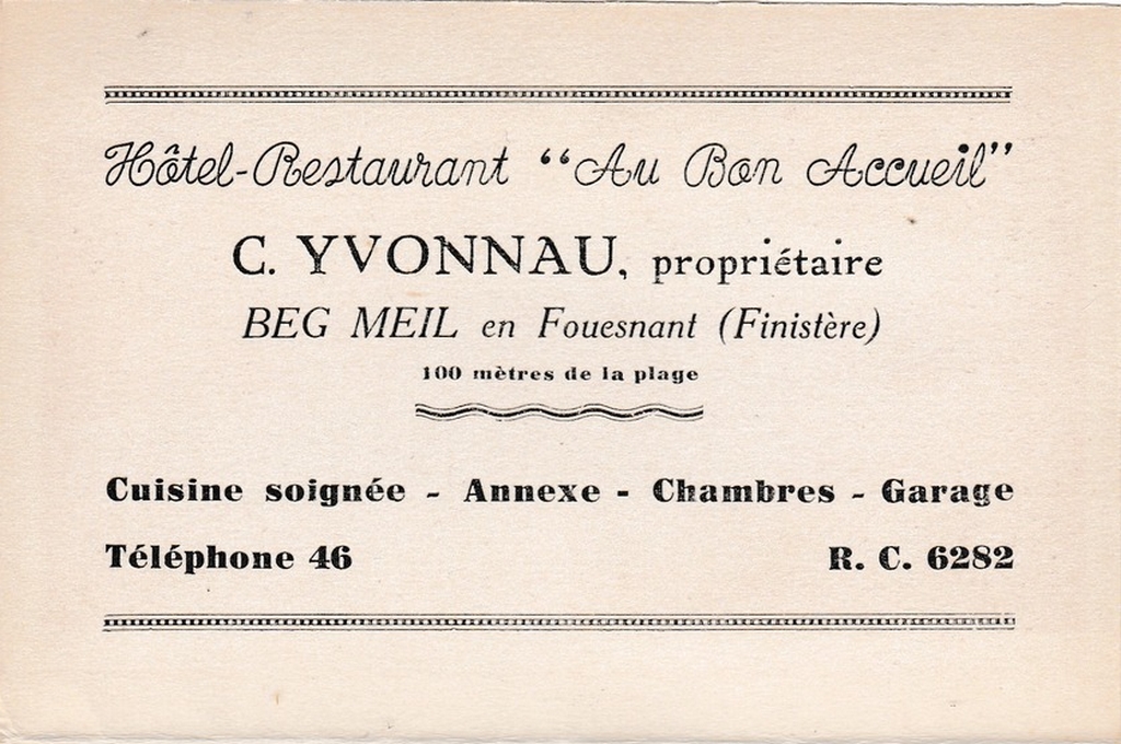 station mondaine de référence, dans le département, durant de longues années. Sur l’emplacement de l’établissement, s’élèveront, à la fin de l’an prochain, vingt-neuf appartements de grand standing avec jardins et ascenseurs. Corentin Yvonnou, figure tutélaire beg-meiloise, avec sa forte corpulence couronnée d’un chapeau breton, exploitait déjà un restaurant, portant le même nom, à l’emplacement actuel de « La Godille ». C’est en 1937 qu’il fit construire l’hôtel qui ne comportait alors qu’un garage (transformé en bar, plus tard) et, à l’étage, une salle de restaurant où venaient déjeuner des réfugiés groisillons, logés dans l’annexe. En 1947, Corentin Yvonnou ajoute un étage avec sept chambres, puis en 1951, un autre étage avec sept nouvelles chambres. Il cèdera l’établissement à son fils Jean, le 31 décembre 1969 et décèdera en 1976. Denise Yvonnou, qui a épousé Jean en 1963, aura ainsi passé 44 ans au « Bon Accueil », reprenant les rênes de l’hôtel après la mort de son mari, en 1991. Elle a connu l’apogée de la station puis son lent déclin. « Dans les années 60, on ouvrait à Pâques. Les touristes venaient de Paris, du Nord, de Belgique, d’Angleterre. Ne disposant pas de voitures, ils restaient trois semaines à l’hôtel en pension complète », se souvient-elle. Et puis, dans les années 80, les mœurs ont évolué. La durée des séjours a diminué. Les campings se sont multipliés. Les hôtels n’ont pas eu les moyens financiers de se mettre en conformité avec les nouvelles normes exigées. Alors, ils ont fermé les uns après les autres. « Il y avait huit hôtels ; il n’en reste plus que deux (le Thalamot, la Cale) », constate Denise Yvonnou.