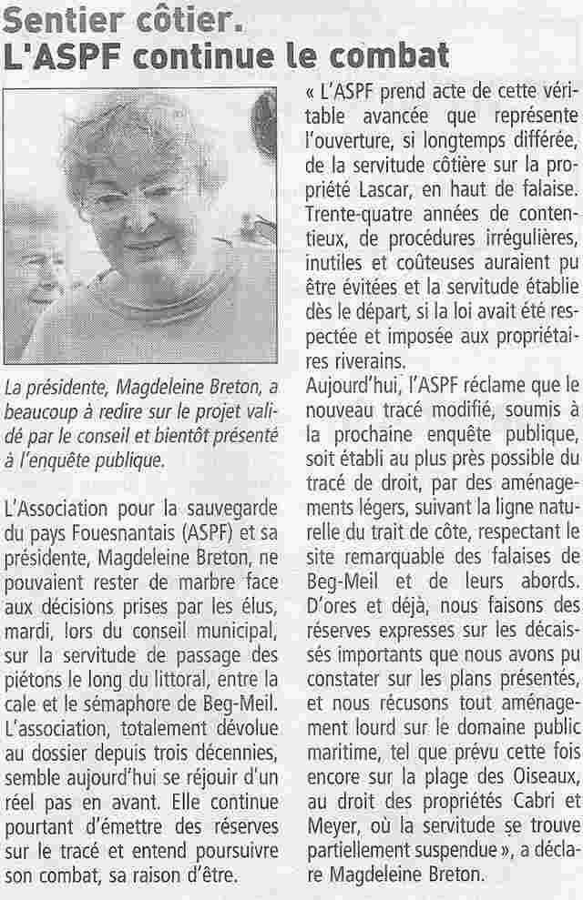 Suite au conseil municipal de mardi, l'ASPF communique : « L'association pour la sauvegarde du Pays fouesnantais (ASPF) prend acte de cette véritable avancée que représente l'ouverture, si longtemps différée, de la servitude côtière sur la propriété Lascar, en haut de falaise. 34 années de contentieux, de procédures irrégulières, inutiles et coûteuses auraient pu être évitées et la servitude, établie dès le départ, si la loi avait été respectée et imposée aux propriétaires riverains.