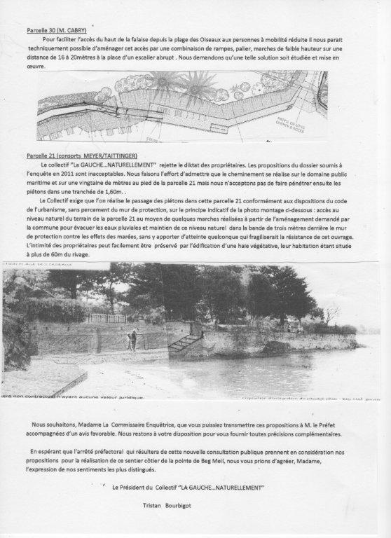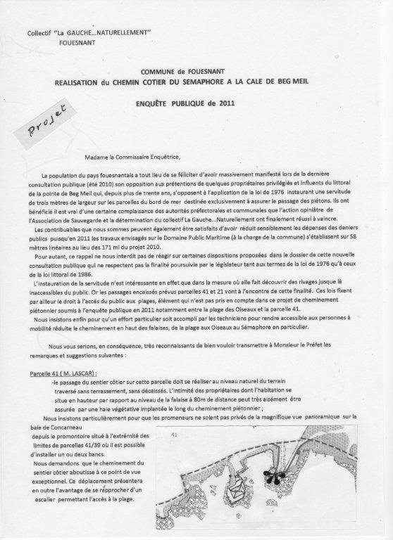 «Le consensus sur la base d'un projet juste, protecteur du paysage, respectueux de l'environnement, tel que vous l'avez défini, ne peut l'être que dans le respect de la loi et dans la prise en compte de l'intérêt général. C'est-à-dire par un tracé au haut des falaises et dans l'emprise de trois mètres, à l'intérieur des propriétés, conformément aux termes de la loi du 31décembre 1976. Toute autre proposition s'exposerait à être perçue comme soucieuse de ménager, non pas des droits, mais des privilèges. Les études réglementaires réalisées par vos services au titre du Code de l'Urbanisme, en 2007 et en 2010 ont démontré qu'aucun obstacle technique ou juridique ne s'opposait à l'application de la loi, le long du littoral, entre le sémaphore et la cale de Beg-Meil. C'est l'attente de toutes les associations»
