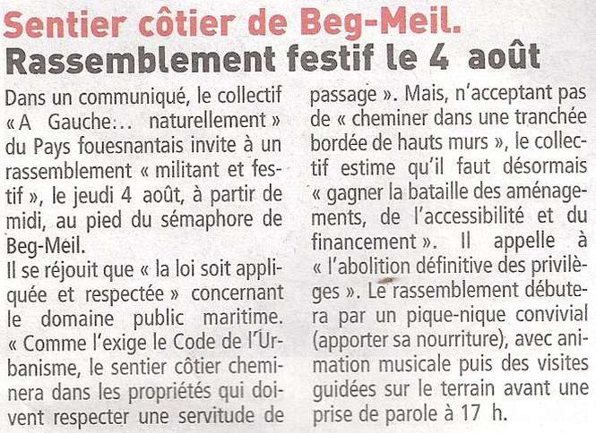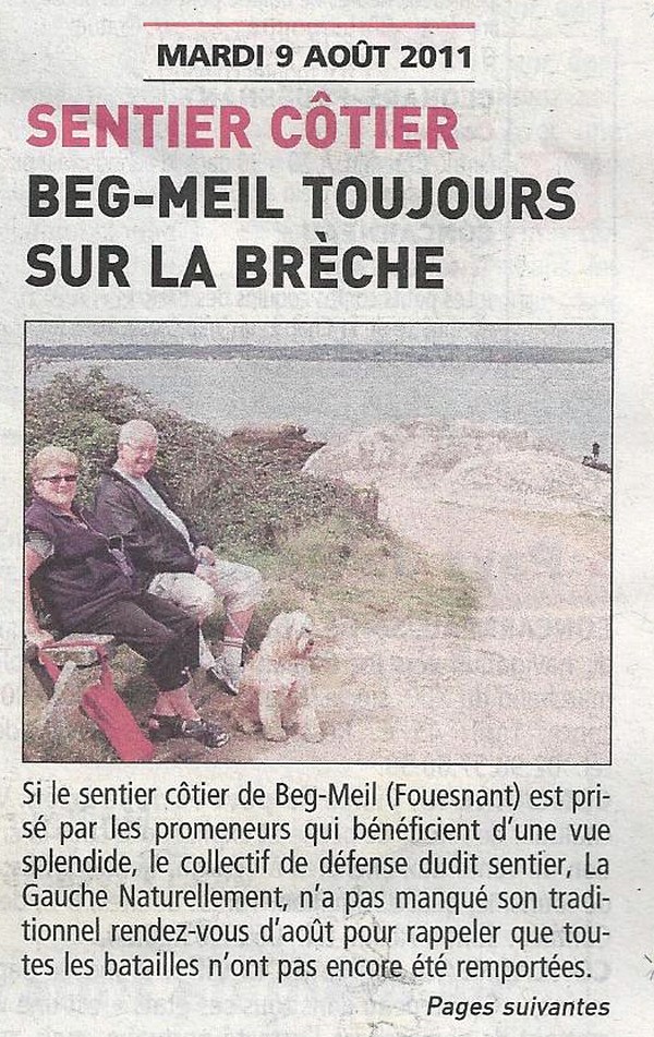 Nous avions pris connaissance par la presse du 22 Novembre 2011 du communiqué de la Préfecture, annonçant que « le Préfet avait signé un arrêté en date du 21 novembre, autorisant le tracé de la servitude de passage des piétons le long du littoral de Fouesnant-Beg-Meil ».