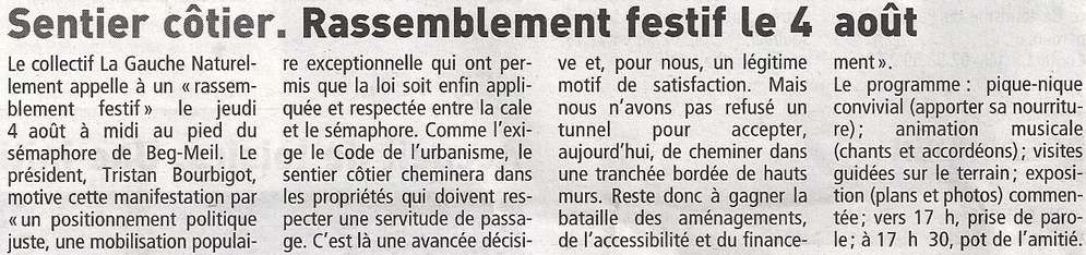 Dans un communiqué, «La Gauche... Naturellement», par la voix de son président Tristan Bourbigot, se réjouit des conclusions favorables de la dernière enquête publique sur le sentier côtier. L'issue d'un combat de longue haleine ? (Lire également en page 8)