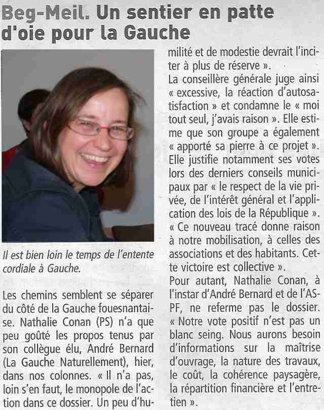 Mardi, les élus fouesnantais avaient l'occasion de mettre un terme à trente années de lutte intestine entre riverains et associations environnementales sur le dossier de servitude de passage des piétons le long du littoral (SPPL) entre la cale et le sémaphore de Beg-Meil. Ce fut chose faite, à l'unanimité (Le Télégramme d'hier). Mais si cette décision est vitale et constitue un pas important vers une issue de secours, elle reste une étape. André Bernard avait exprimé lors du conseil sa satisfaction de «voir enfin le bon sens triompher». Il n'a pas manqué d'égratigner Roger Le Goff et les projets présentés ces dernières années. Il a ainsi accusé le maire de se poser en «artisan principal de l'avancée du dossier» et d'avoir cautionné l'an passé un tracé «invraisemblable». Mais également Nathalie Conan (PS) à qui il reproche une «abstention complice» en 2010. «Les seuls combats qu'on est sûrs de perdre sont ceux qu'on n'a pas menés». Après avoir rendu hommage à l'opiniâtreté de l'Association de sauvegarde du Pays Fouesnantais (ASPF), il a affirmé, «sans fanfaronnade», le rôle déterminant joué par La Gauche Naturellement, qui a su «exhumer le dossier et multiplier les manifestations et actions».