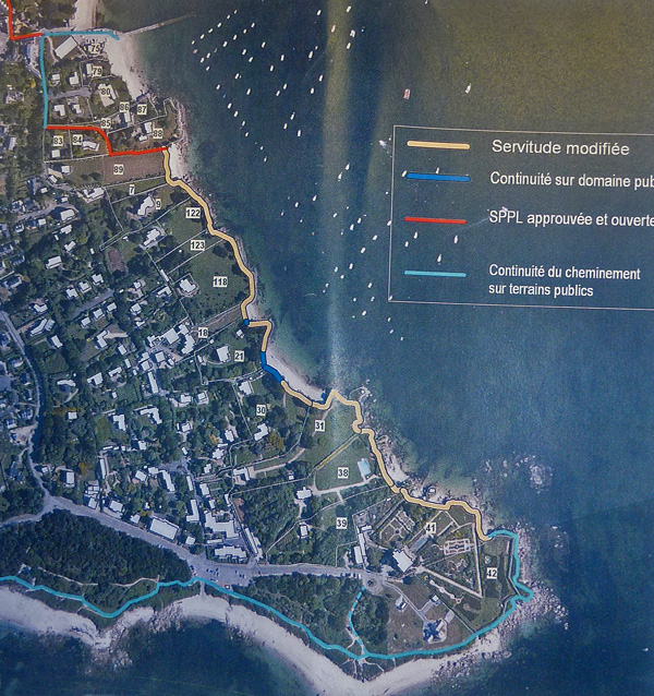 Les projets de Servitude de passage des piétons le long du littoral (SPPL) et d'ouvrages sur le domaine public maritime (DPM) permettant d'assurer la continuité du chemin, avaient été soumis à enquêtes publiques en 2010. Le préfet n'avait pas donné suite à ces enquêtes, compte tenu du manque de consensus. De nouvelles discussions avec les propriétaires riverains ont été engagées par le maire afin d'aboutir au projet de servitude modifiée. Le nouveau tracé assure désormais la continuité du sentier : libre passage des piétons, sécurité du cheminement en retrait suffisant des aplombs de falaise, intimité des résidents protégés. Les gros points litigieux ont été revus de façon conséquente. Exit le tunnel de la parcelle 41, la passerelle de la parcelle 21, les multiples escaliers. Le tracé s'inscrit en haut de falaise, à l'intérieur des propriétés. La mer sera vue partout, sauf durant quelques mètres, derrière le kiosque de la parcelle 41.