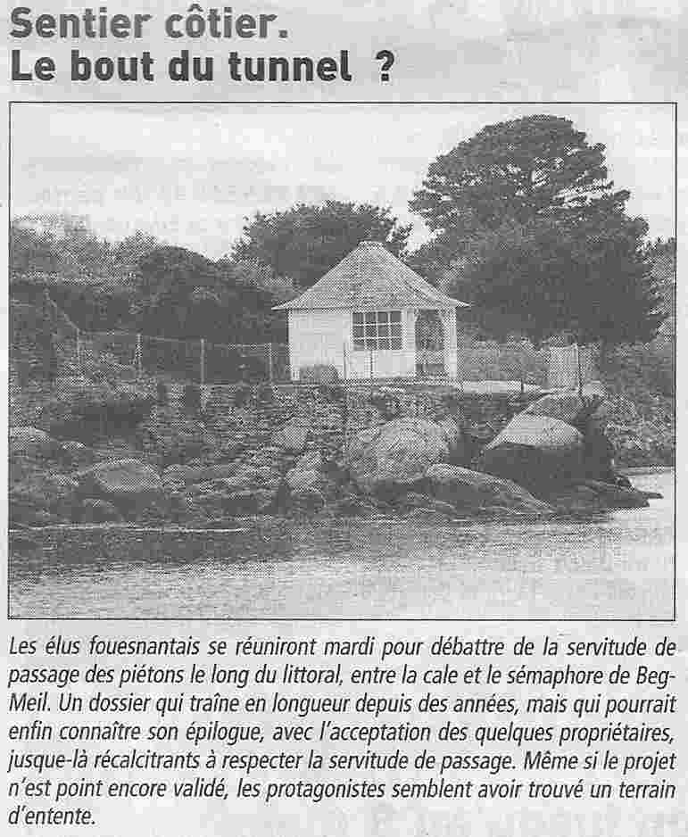 Mardi soir, lors du conseil municipal extraordinaire, on a semblé enfin voir le bout du tunnel : les conseillers ont voté à l'unanimité le nouveau tracé du sentier côtier de Beg-Meil, « projet souvent débattu et qui revient pour la énième fois » (Roger Le Goff).